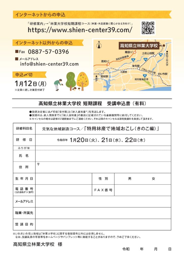 また、お申込みはこちら⇒「林業大学校 短期課程」または郵送・FAX・メールでお願いします。