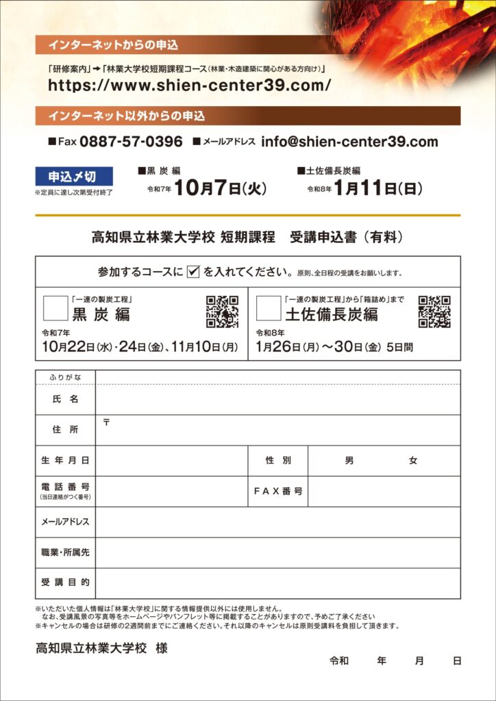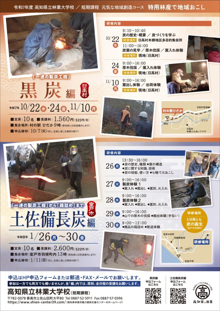 お知らせ・イベント情報 HOME > NEWS > 短期課程「特用林産で地域おこし」 土佐備長炭編 NEWSEVENT研修情報 2025/10/22 記事一覧に戻る 短期課程「特用林産で地域おこし」 土佐備長炭編 「元気な地域創造コース」の科目の一つである 「特用林産で地域おこし 土佐備長炭編」です。 1月26日(月)~30日(金)の5日間・室戸市となっています。 研修内容は、炭の歴史や知識、技術の概論から製炭体験、商品化などです。 詳しくはこちら⇒「チラシ」をご覧ください。 また、お申込みはこちら↓ 「土佐備長炭編」 または郵送・FAX・メールでお願いします。 NEWSEVENT研修情報 2025/10/22 記事一覧に戻る カテゴリ 正直に答えて!卒業生 NEWS EVENT 入試情報 研修情報 未分類 タグ ATI あつかんDRAGON おだち アーボリスト オープンキャンパス 入試情報 卒業生 土佐備長炭 室戸市 木造建築 木造設計 林業 林業大学校 正直に答えて 特殊伐採 特用林産 短期課程 研修生募集 移住 高知県 高知県立林業大学校 新着情報 木造設計コース研修生募集中! 2025年10月21日 令和8年度一般選考(2回目)と推薦選考(2回目)を実施します(申請期間10月16日~11月14日) 2025年10月15日 短期課程「特用林産で地域おこし」 土佐備長炭編 2025年10月22日 【開催案内】短期課程技術支援コース「アーボリスト(特殊伐採技術者)養成」 2025年10月10日