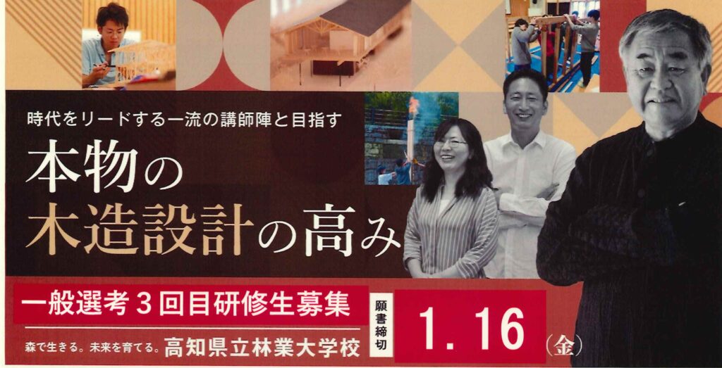高知県立林業大学校では、専攻課程・木造設計コースの一般選考(3回目)を実施します。(申請期間12月22日(月)から1月16日(金))