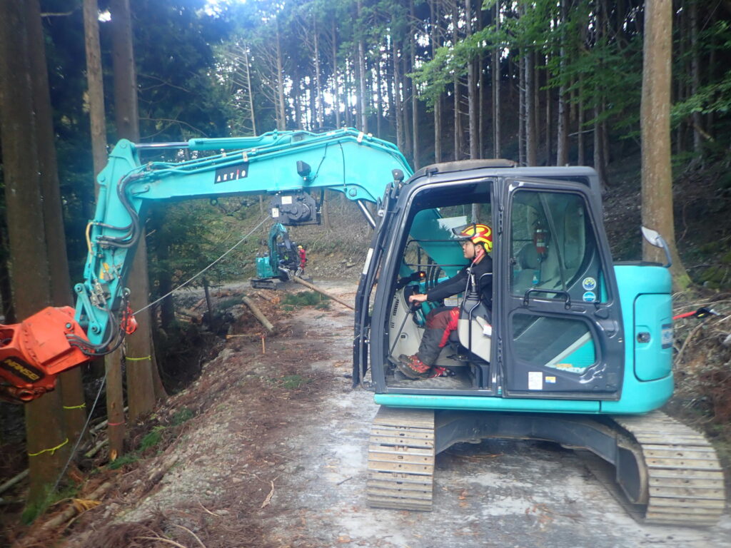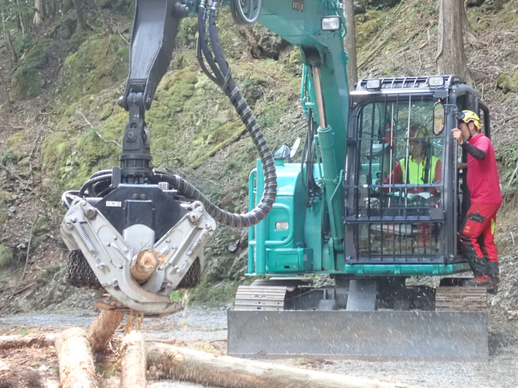 今回の実習では、伐倒した木を集材するウインチ付きグラップルと、集材した木の枝払い、玉切りを行うプロセッサを使用しました。
