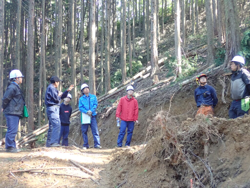 その後、実際に提案した施業を行っている施業地に赴き、現場の作業員の方も交えて、現地の概要を説明していただき、実際の現場を視察させていただきました。施業の同意を得るためには、所有者と積極的にコミュニケーションをとることや、必要となる知識の習得、長期間の計画に基づき施業を進めていくために将来を見据えた計画を作ることの重要性を、講師自身の経験をもとに教えていただきました。