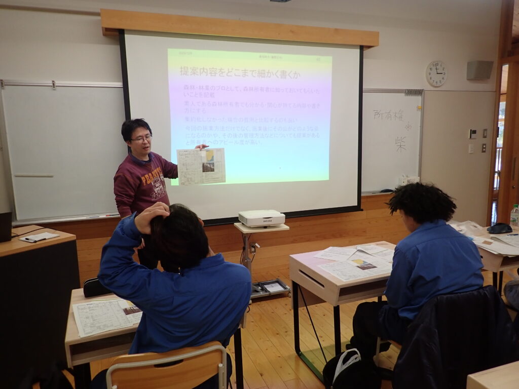 講義では、提案型集約化施業の概要やそれを推進する役割である森林施業プランナーについての基礎知識、森林所有者に施業を提案する際に使用する森林施業プランの作成方法と提案の際の注意点等を演習を交えて学びました。