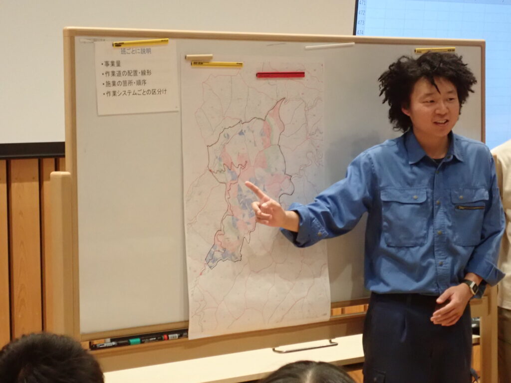 林業では、現場で使用する作業技術とは別に、森林所有者の理解や納得を得られる施業内容を提案できることも重要な技術です。この時間は、研修生の皆さんがそのことを知ることができた貴重な時間であり、現場で今回得られた技術や知識を是非活用してほしいです。