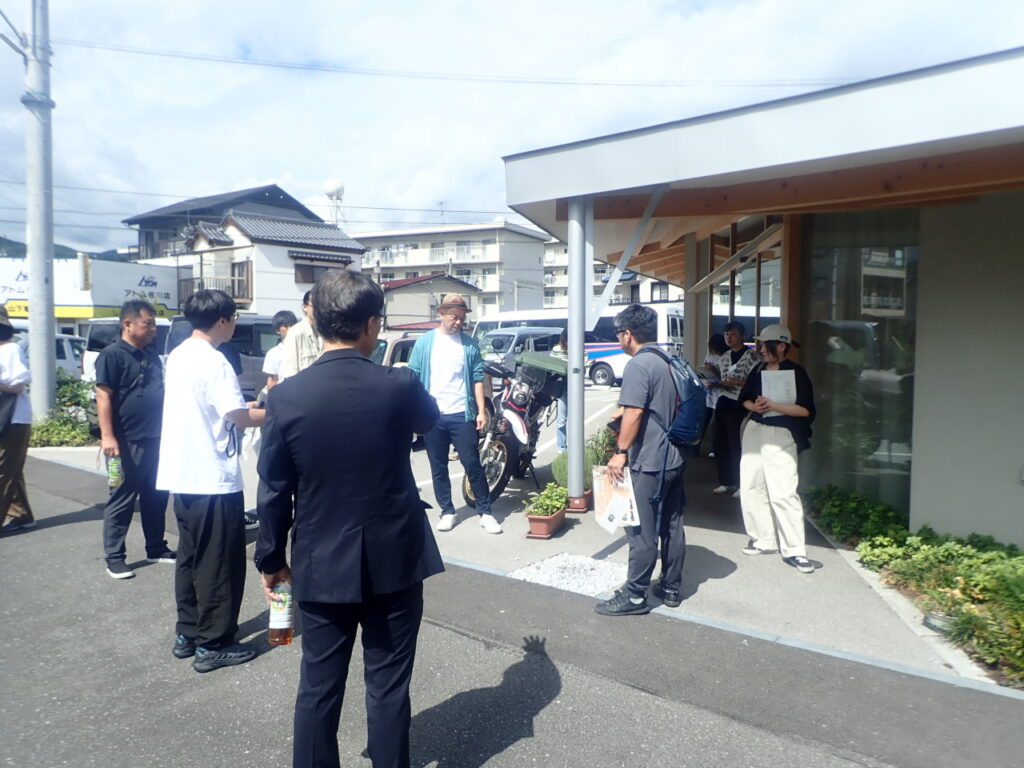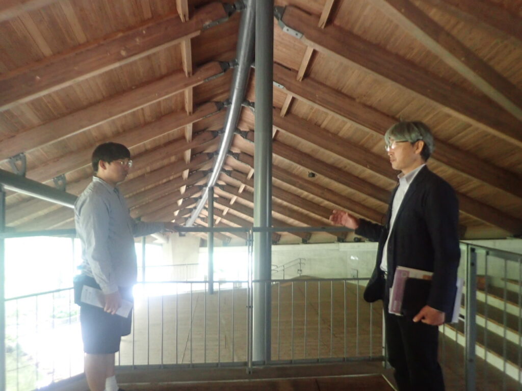 案内は、STUDIO YY共同代表の中本 剛志氏でした。張弦梁による切妻屋根が美しく特徴的な木造建築です。