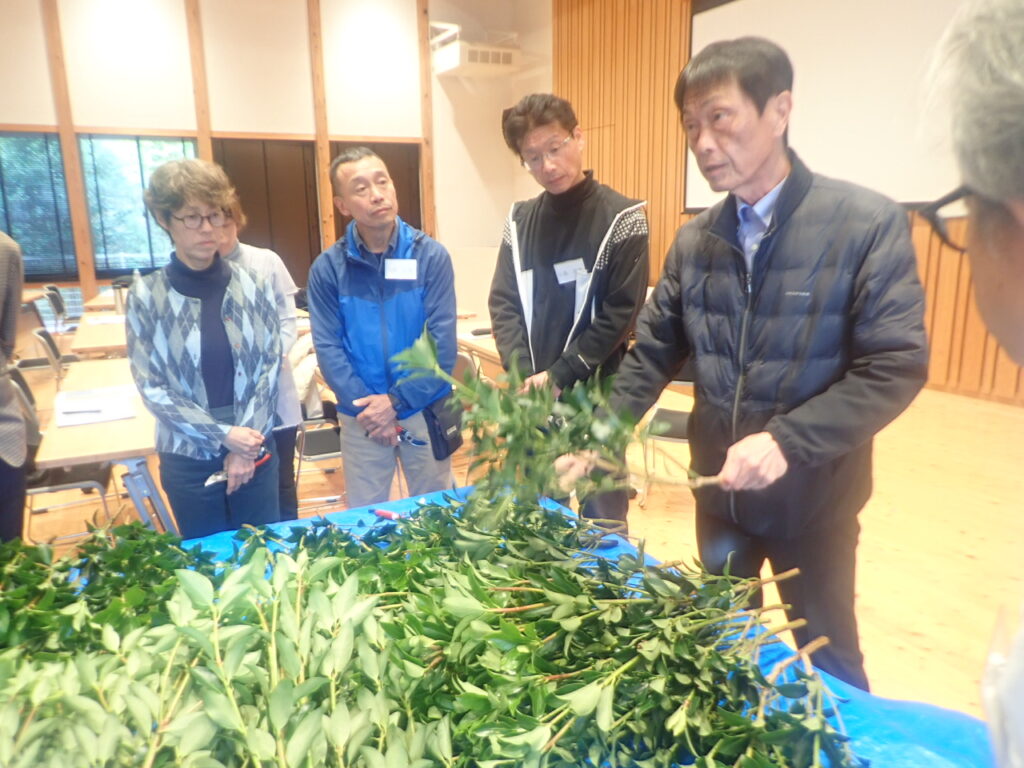 午後は、スーパーのバイヤー・小松雄一郎さんから、「小売店に求められる加工方法(収穫・出荷形態など)」について、市場・小売店に求められるシキミ・サカキの話を聞いた後、小束くくりの実習を行いました。