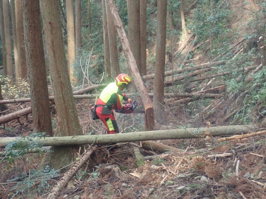 現場では4班に分かれ、伐倒木の選定、間伐手順、かかり木の処理方法などの指導を受けました。