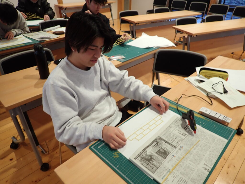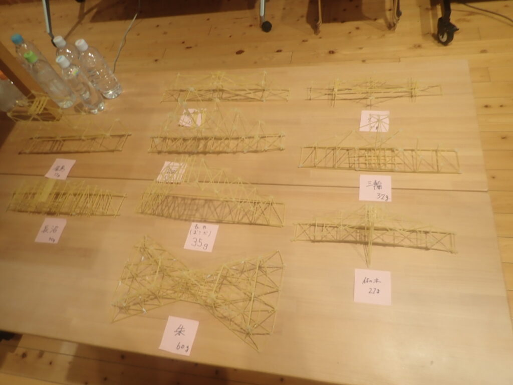 山田先生の講義でリカレントと研修生併せて9名でパスタブリッジコンテストを行いました。パスタで30cmの橋を渡し荷重をかけて競うコンテストです。パスタはグルーガンで接着させます。実質4時間程度で作成しましたがグルーガンがうまく接着できないなど悪戦苦闘しました。コンテストでは1,000gを超える荷重に耐える作品もあれば、すぐ壊れてしまう作品もあり、どこが強く、どこが弱かったか等先生からアドバイスをいただき勉強になりました。
