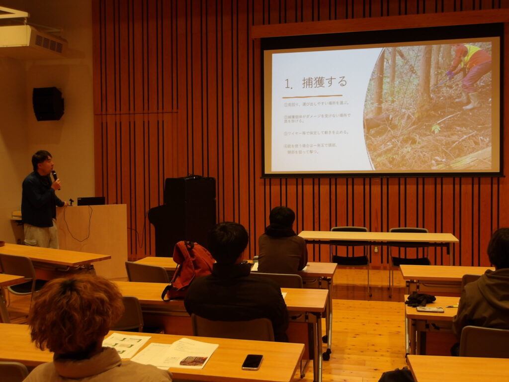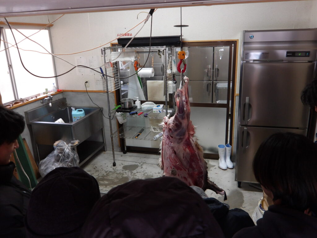 活動報告(研修風景) HOME > 活動報告(研修風景) > 専攻課程 > 森林管理コース > 専攻課程_鳥獣被害対策(捕獲後の処理・流通) 2026/03/22 記事一覧に戻る 専攻課程_鳥獣被害対策(捕獲後の処理・流通) 2月10日は、高知ジビエ工房の橘木氏を講師に迎え、わなや銃で狩猟した鳥獣をジビエとして利用するための処理方法やジビエの流通等について学びました。 特に鳥獣の処理方法については、狩猟後のシカの解体方法を実際の解体場で見学し、解体の難しさと狩猟した生き物を大切にいただいているのだということを言葉だけでは無く見ることで学ぶ貴重な経験ができました。 2026/03/22 記事一覧に戻る カテゴリ インターンシップ オープンキャンパス その他 リカレント 公開講座 基礎課程 実習報告 専攻課程 木造設計コース 林業技術コース 森林管理コース 活動報告カテゴリー1 短期課程 行事・イベント 講義報告 タグ QGIS きのこ サカキ シキミ チェンソー チェンソーワーク ドローン 伐木造材技術 備長炭 公開講座 安井昇 専攻課程 建築士 建築学生向け集中講座 提案型集約化施業 日高村 木材コーディネーター 木造塾 木造建築 木造設計 木造設計コース 木造防耐火 林業 林業大学校 林業学校 林業技術コース 林業機械 架線 森林GIS 森林情報 森林情報学 森林施業プランナー 森林管理コース 樹木医 牧野富太郎 牧野植物園 特用林産 短期課程 菊炭 隈研吾 高性能林業機械 高知県 高知県立林業大学校 鳥獣被害対策 黒炭 新着情報 専攻課程_鳥獣被害対策(捕獲後の処理・流通) 2026年3月22日 専攻課程_鳥獣被害対策(安全管理・捕獲技術) 2026年3月21日 2月6日 基礎課程「林業機械実習(架線作業見学)」 2026年3月21日 1月15日 基礎課程「切り捨て間伐実習」 2026年3月20日